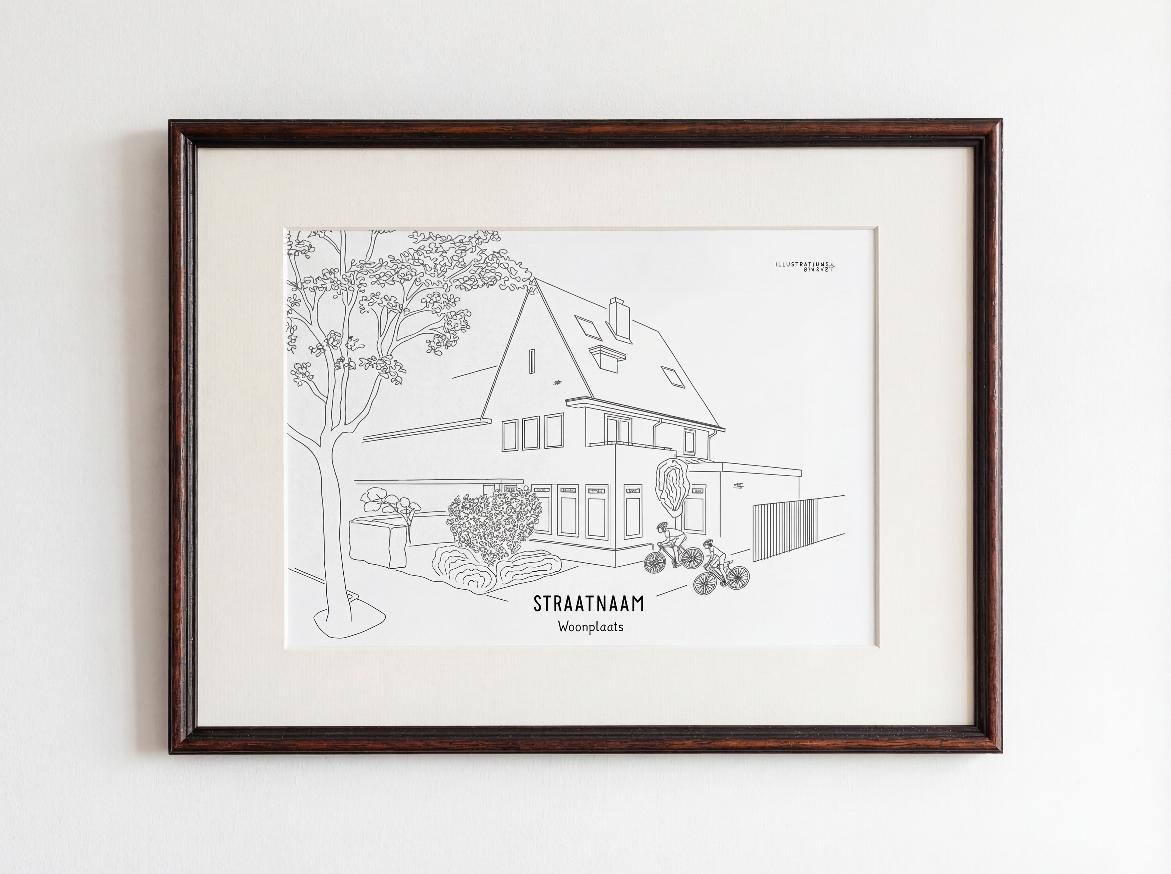 Persoonlijke illustratie woning 400x300 mm ingelijst met passe-partout