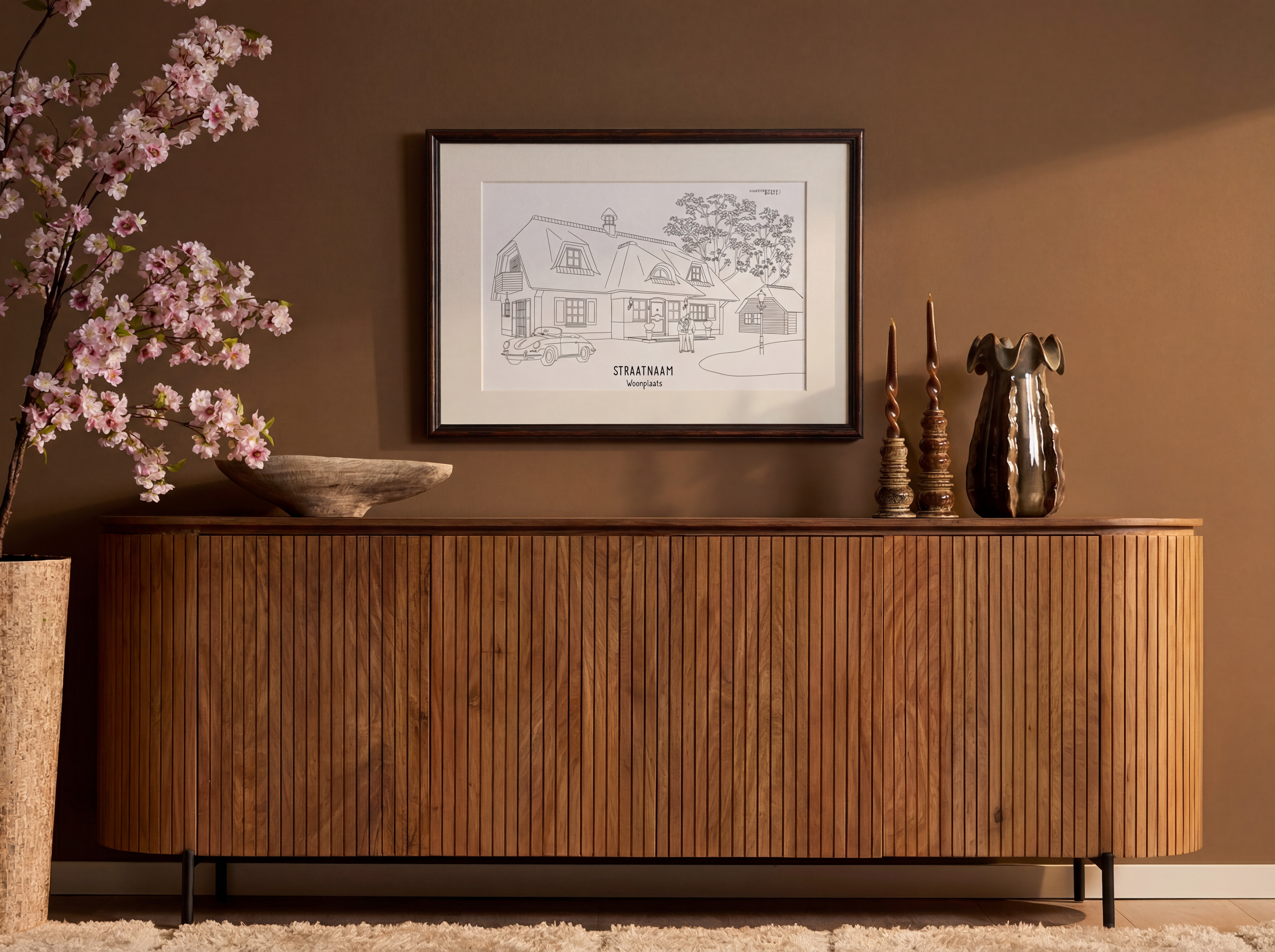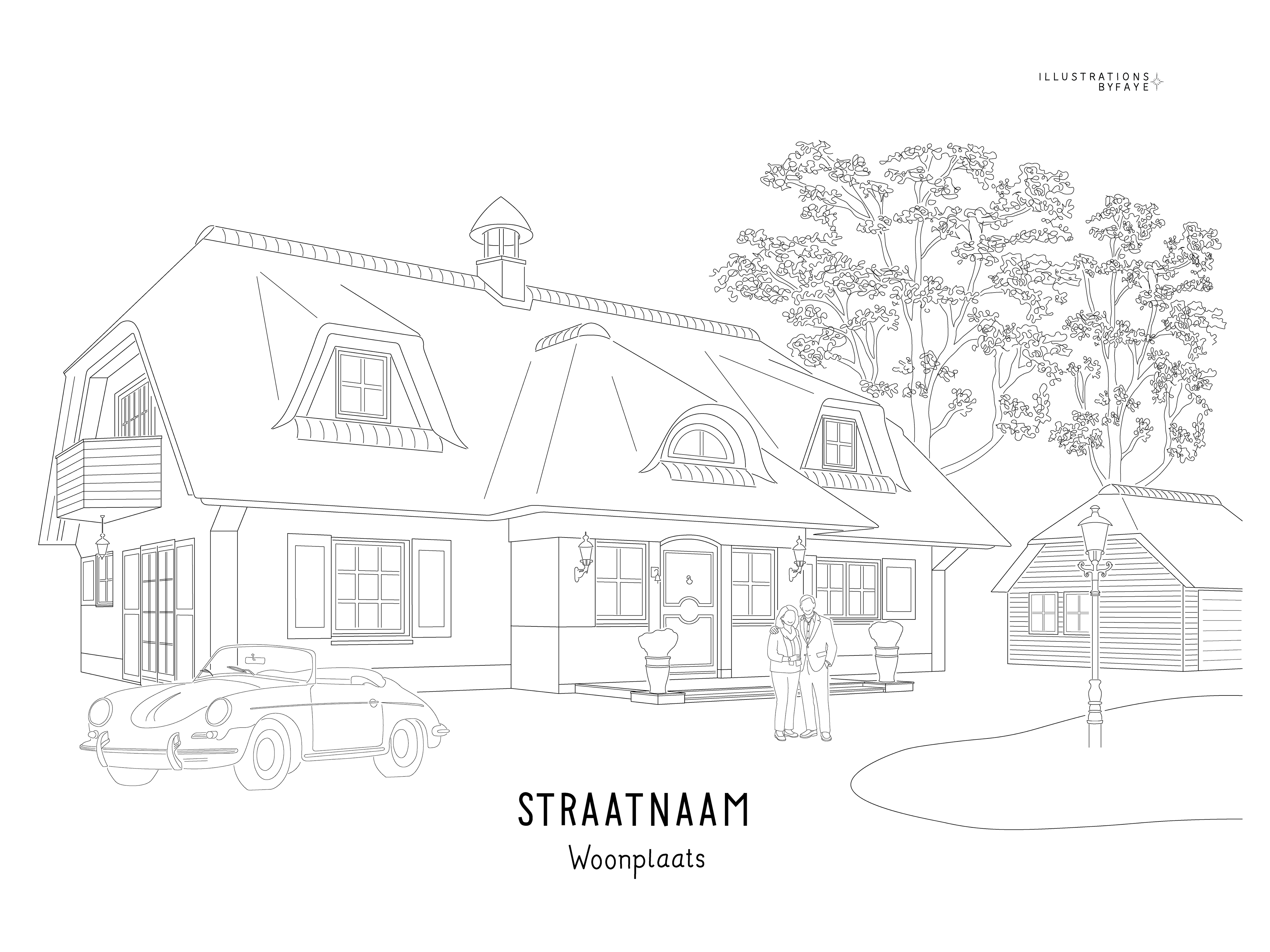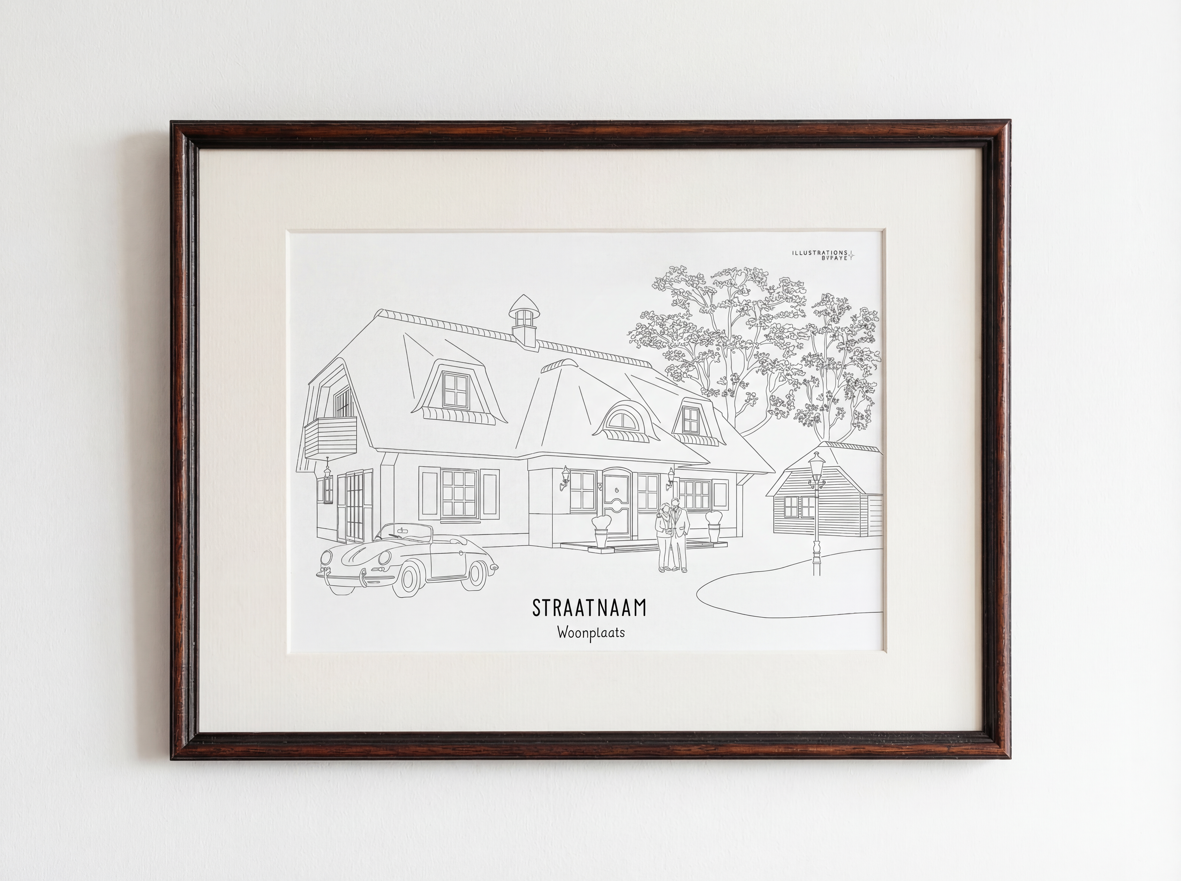 Persoonlijke illustratie woning 400x300 mm ingelijst met passe-partout